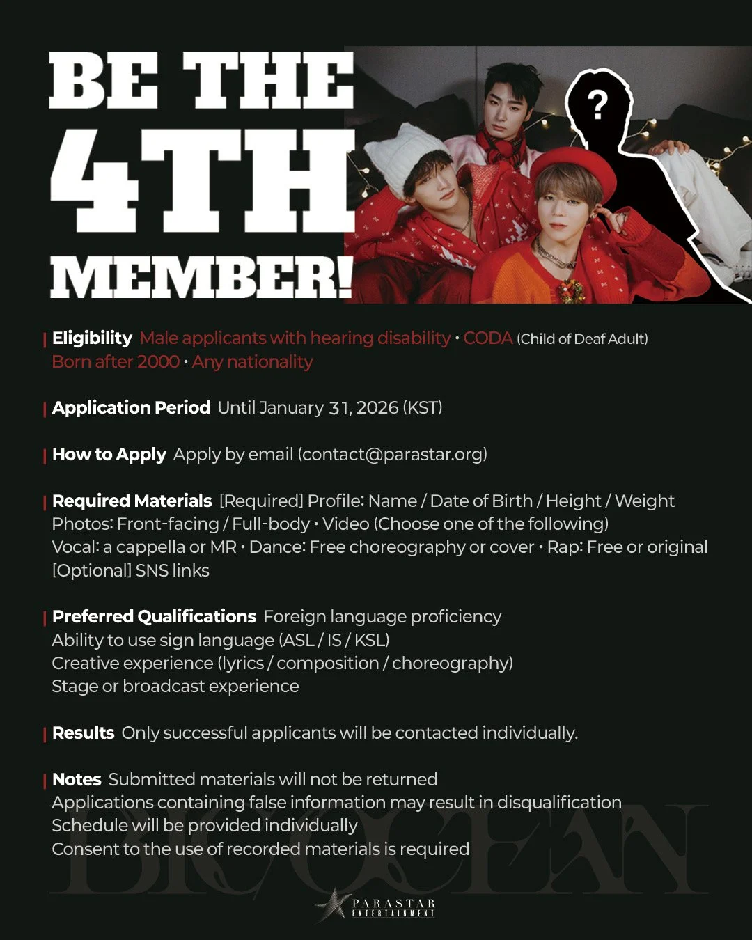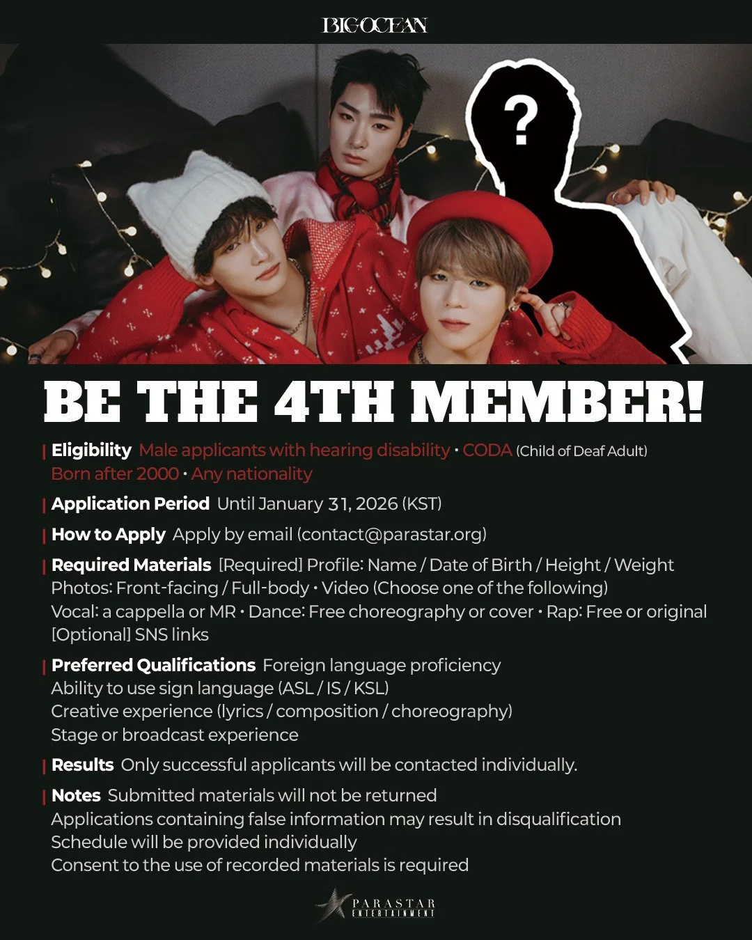 Parastar Entertainment’s announcement of a global audition for Big Ocean reinforces the group’s position as one of the most meaningful and forward-thinking projects in K-pop today. Rather than treating accessibility as a side note, the press release makes it clear that inclusion is the foundation of Big Ocean’s identity and continued growth.